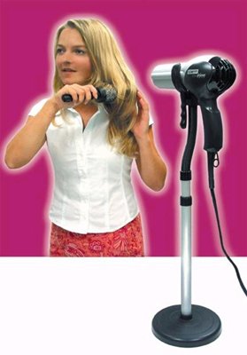 This amazing styling stand holds your hair dryer, leaving both hands free for styling with brush and comb.